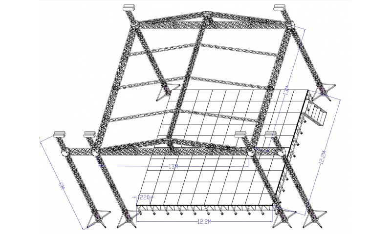 Armazón de techo Topfinger Peak (Tamaño: 13*13*8m y Tamaño del escenario: 12,2*12,2*1m y Código: TFR-PRT11)